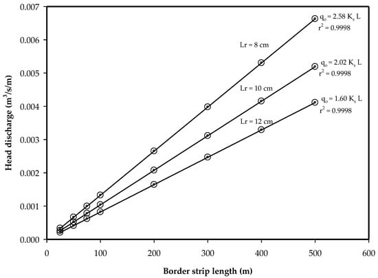 A linear relationship has been validated between the length of the border and the optimal irrigation flow, defined as the inflow rate that has to be applied to obtain a maximum value of Christiansen’s uniformity coefficient with high values of application efficiency and irrigation requirement efficiency. The linear form of the proportion between both variables was corroborated by [39] using a hydrological model for the flow of surface water and the Green and Ampt infiltration equation.