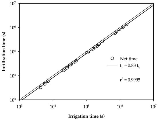 Irrigation time (τb) shown in Table 3 corresponds to the gross irrigation depth and is greater than the infiltration time corresponding to the net depth calculated from Equation (16): τn = ℓn/qu. Figure 2 shows the relationship between the two times; one has τn ≈ 0.83 τb with r2 = 0.9995, which indicates that, according to Equation (17), the average application efficiency with the optimal flow is ηA ≈ 83% for analyzed soils.