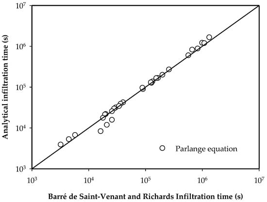In Table 4, the values of sorptivity and the shape parameter for different soils are reported. In Figure 3, the optimal infiltration time obtained with Saint-Venant and Richards equations is compared with that obtained with Equation (28) of Parlange et al. [44]: r2 = 0.9866.