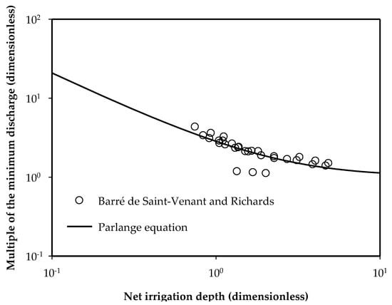 The multiple factors of the minimum discharge as a function of the irrigation depth numerically obtained with the Saint-Venant and Richards equations, and those calculated with the Parlange et al. model [44], Equation (30).