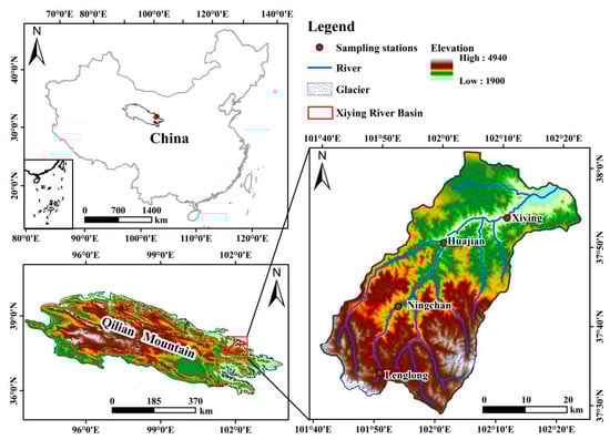 The Qilian Mountains are the source of more than 100 rivers, one of which, the Xiying River has a large flow and is located in the eastern part of the mountain (101°40′47″~102°23′5″ E, 37°28’22″~38°1′42″ N). The Shuiguan, Ningchang, Xiangshui, and Tuta rivers flow into the Xiying river from the southwest to the northeast, and finally, it flows into the Xiying reservoir. In spring, as temperatures rise and snow melts, the flood season begins, reaching a peak in summer, when precipitation is at its highest. The study area is located in the alpine and semi-arid areas of the Qilian Mountains, at an altitude of 2000 to 5000 m. This basin has a continental temperate arid climate with strong solar radiation, long sunshine hours, and large diurnal temperature differences. Annual precipitation ranges from 300 to 600 mm, but annual evaporation is also high, varying from 700 to 1200 mm. In the upper reaches of the basin, there are clear vegetation zones of mainly temperate coniferous forest, alpine azalea shrub, and desert steppe vegetation. The middle and lower reaches are mainly bare land, with little vegetation coverage. Soils are mainly lime, chestnut, alpine scrub meadow, and desert soil (Figure 1).