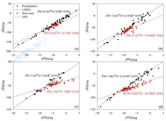 Relationship between soil water δ2H and δ18O at each sampling point ((a) Lenglong; (b) Ningchan; (c) Huajian; (d) Xiying).