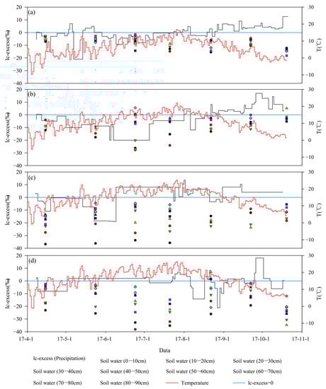 In the formula, a and b are the slope and intercept of LMWL, respectively, δ2H and δ18O are the hydrogen and oxygen isotope values in the sample. Based on the precision of the isotope analysis and the slope of the LMWL, the lc-excess of soil water and rainfall was derived, and their uncertainty was estimated to be ±2.27‰. The physical meaning of lc-excess is expressed as the degree of deviation of the isotope value in the sample from the LMWL, indicating the non-equilibrium dynamic fractionation process caused by evaporation []. Generally, the change of lc-excess in local precipitation is mainly affected by different water vapor sources, and the annual average is 0. Since the stable isotopes in soil water are enriched by evaporation, the average lc-excess is usually negative [].
