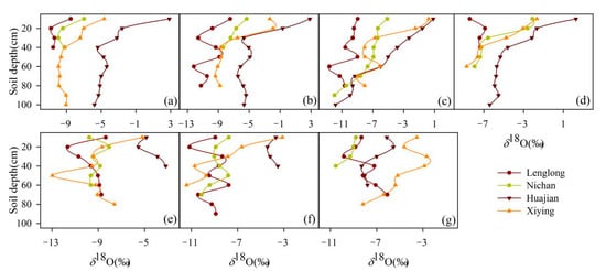 Profile variation of soil water δ18O at the four stations in the study area ((a) Apr; (b) May; (c) Jun; (d) July; (e) Aug; (f) Sept; (g) Oct).
