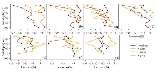 Profile variation of soil water lc-excess at the four stations in the study area ((a) Apr; (b) May; (c) Jun; (d) July; (e) Aug; (f) Sept; (g) Oct).