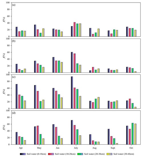 Monthly change of the 0 to 40 cm soil layer evaporation loss f at the four stations from April to October based on δ18O ((a) Lenglong; (b) Ningchan; (c) Huajian; (d) Xiying).