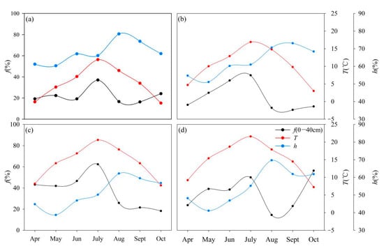 Changes in temperature, relative humidity, and 0 to 40 cm mean value of evaporation loss f at the four stations during the observation period ((a) Lenglong; (b) Ningchan; (c) Huajian; (d) Xiying).