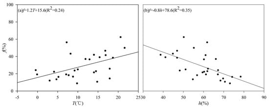 Evaporation is the process in which the kinetic energy of the thermal motion of the molecules in a liquid reaches a certain level, breaking free from the liquid surface and entering the air [,,,,]. In the study of water evaporation, the temperature is always the main factor affecting water evaporation []. The diffusion coefficient of water vapor, saturated water vapor density, and hydraulic conductivity all depend on temperature and its change, accordingly []. Theoretically, there is a positive correlation between water evaporation intensity and air temperature [,]. As far as the entire watershed is concerned, the temperature T and the evaporation loss f of soil moisture show a positive correlation (Figure 9), which is similar to the theoretical and past research results [,,]. The four soil sampling sites have a large altitude difference. The lower the altitude the higher the temperature, and the temperature will accelerate the irregular movement rate of water molecules, which will lead to stronger evaporation []. During the observation period, the temperature at each station began to rise from April. Among them, the temperature at the Xiying (9.2 °C) and Huajian (8.2 °C) stations was higher, followed by the Ningchan station (4.7 °C), and the Lenglong station had the lowest temperature of only −0.1 °C. In July, the temperature at each station rose to the maximum, from the top to the foot of the mountain, they were 11.9, 16.9, 20.6, and 21.6 °C, respectively, and began to decrease in August. By October, the temperature at the Huajian station (7.7 °C) was the highest. The average loss of soil moisture from 0 to 40 cm at the Lenglong, Ningchan, and Huajian stations changes similar to temperature. The evaporation loss increases from April to July, the evaporation loss f in July is significantly higher than that in the other months and starts to decrease in August. The Xiying station has different trends. The station has two rising periods during the observation period. The period from April to July is consistent with other stations, which is a period of increased evaporation loss, decreased in August, and another period of rising in September and October. Che found similar seasonal changes in the western Loess Plateau []. Comparing different stations, the evaporation loss f at the Huajian and Xiying stations is relatively large, while the Lenglong and Ningchan stations are relatively small. From this point of view, the change trend of the evaporation loss f at different sites in the Xiying River Basin during most months of the observation period is essentially the same as the temperature, but the degree of influence of the temperature on evaporation at different sites is different. For example, during August and October, the temperature at the Huajian station was not much different from that at the Xiying station, but the evaporation loss was significantly different between the two stations. Similarly, although the temperature at the Lenglong station is lower than that at the Ningchan station, the evaporation loss of the former is higher than that of the latter after August (Figure 8) [].