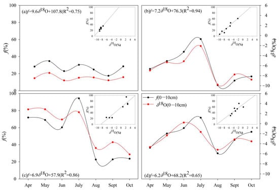 Changes of δ18O and evaporation loss f in 0 to 10 cm soil water at the four stations during the observation period ((a) Lenglong; (b) Ningchan; (c) Huajian; (d) Xiying).