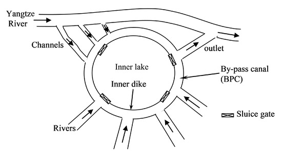 Previous studies mainly focus on the identification and characteristics of the hydrological drought as well as the factors that induce the extreme drought event in the Dongting Lake area [1,8,9,14,15,16]. Few studies investigate how to enhance the water supply of Dongting Lake [18,19]. Actually, apart from the environmental change (e.g., climate change and human activities), one of the main reasons for the water shortage problem in the Dongting Lake area is that the lake cannot contain its floodwater till the dry period since it is connected with Yangtze River directly, as shown in Figure 1. Therefore, to solve its water shortage problem, one has to convert its floodwater into water resources in the dry period. Yang et al. [20] and Liu et al. [21] proposed an innovative flood control scheme (IFCS) as shown in Figure 1. Together with the existing dike surrounding the lake, they suggest building an inner dike with several gates to form an inner lake for mitigation of flood disaster in wet seasons. At the beginning of wet seasons, the lake water is lowered to its dead water level. During the flood period, the peak floodwater could be diverted into the inner lake for storage by opening the gates, thus the inner lake functions as a giant flood-detention pond. More details could be found in the previous study [21]. The stored water will be released when the gates are open to regulate the outflow in the dry seasons. Therefore, a huge amount of floodwater stored in the inner lake can be converted to water resources in dry seasons.