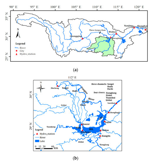 The location of Dongting Lake. The lake collects water from the Yangtze River through ‘three channels’ (Songzi, Hudu, and Ouchi) and ‘four rivers’ (Xiangjiang, Zishui, Yuanshui, and Lishui) and discharges to the Yangtze River at Chenglingji. (a) The location of Dongting Lake catchment; (b) Dongting lake and its main tributaries.