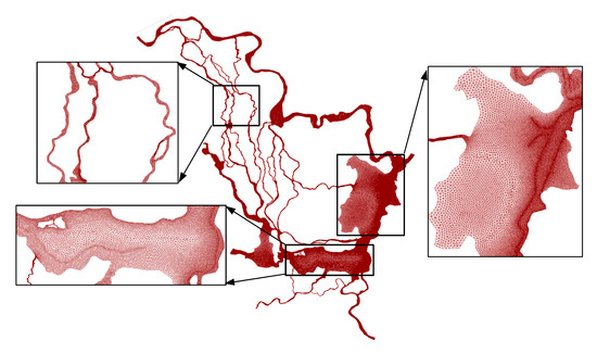 A previously calibrated 2D depth-averaged hydrodynamic model (Mike 21 FM) was used in this study since it could simulate the hydrodynamic process well in Dongting Lake [21]. The model covers the whole area of Dongting Lake, “three channels”, “four rivers” and a part of the middle reach of Yangtze River. It was constructed by 210,341 triangular elements to capture the complex lake bathymetry (see Figure 3). The element size varies from 30 m in narrow channels to 700 m in the lake area by trial and error. The upstream boundary conditions were specified as the daily inflow records of Yangtze River (i.e., Zhicheng station) and the four rivers (Xiangtan station, Taojiang station, Taoyuan station and Jinshi station). The downstream boundary condition used the rating curve observed at Luoshan station on Yangtze River [21]. The wetting and drying process function [27] was used as the water surface varies significantly in the lake area [28]. Previously calibrated parameters such as Manning roughness number (from 32 m1/3/s to 60 m1/3/s) of the lake and the minimum time step (i.e., 2s) were used in the current module. More details of the model could be found in the previous study [21], thus a brief description of the model is given here.