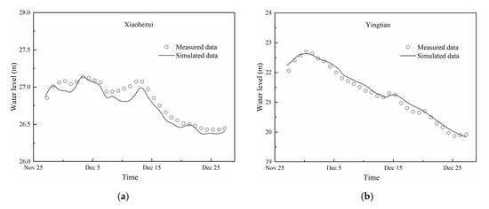 The 2D hydrodynamic model was validated using the measured water level at the stations in the lake (i.e., Nanzui, Yintan, Lujiao and Chenglji stations, see Figure 2) during the dry season of 2006. Figure 4 shows the comparison of the measured and simulated water level process at the selected stations in Dongting Lake. The results show that the model can simulate the water level fluctuation in the lake successfully since the simulated results agree well with the measured data. The uncertainty of the model was estimated by the Nash-Sutcliffe efficiency coefficients (NSE), determination coefficient (R2), the difference of the maximum water level, and the root-mean-square error (RMSE) (see Table 1). The result shows that the NSE value in ranges of 0.887 to 0.981, the R2 values are greater than 0.96, the RMSE values are less than 0.2 m and the average water level differences are within 0.15 m, which indicates that the hydrodynamic model could represent the flow process of the lake during the dry season.