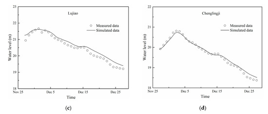 Comparison of water level process during the dry season (November to December) in 2006. (a) Xiaohezui; (b) Yingtian; (c) Lujiao; (d) Chenglingji.