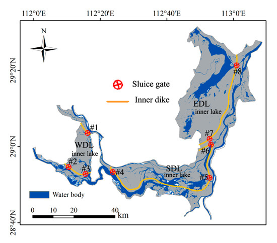 The inner dikes with sluice gates of the IFCS were proposed in Figure 5, where the gates are represented by the void red circle with a cross inside and the inner dikes are marked by the solid yellow line. The inner dikes are built along the mainstream in the Dongting Lake, thus the safe floodwater could be discharged to the downstream smoothly through the mainstream [21]. The area of the inner lake of WDL, SDL, and EDL is 190 km2, 560 km2, and 969 km2, respectively. The water level should be lowered to its dead water level (i.e., 29.0 m in WDL, 27.5 m in SDL, and 26 m in EDL) in the inner lake at the end of the dry season [21] and thereby there is enough flood control capacity to mitigate the flood disaster. During the flood season, the excess floodwater could be discharged into the inner lake by opening the sluice gate when the peak flood wave arrives [20] and the safe floodwater would flow to the downstream through the mainstream by closing the sluice gates. Therefore, a huge amount of floodwater is stored in the inner lake after the flooding period, which could be used to alleviate the water shortage crisis during the dry season. More details could be found in the previous study [21].