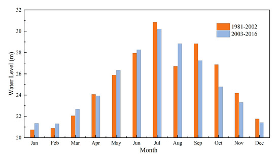 To analyze the long term change of the water level in the dry season of Dongting Lake, the period of 1981–2016 was divided into two typical periods, i.e., 1981–2002 (pre-TGD) and 2003–2016 (post-TGD), according to the operation year (i.e., 2003) of TGD [8,9]. Normally, the dry season starts from November to March (next year) in the Dongting Lake area. The water impoundment period is usually from the late September to December while the discharge period is from January to May, but it would be adjusted depending on the inflow from the upstream of TGD [29]. Figure 6 shows the monthly average water level during the two periods. The water level increases from January to March due to the discharge of TGD, while it decreased considerably from September to December due to the impoundment of TGD. Therefore, the drought severity could be alleviated from January to March (i.e., the average monthly water level increased by about 0.6 m), while it would be exacerbated from November (i.e., the mean monthly water level decreased by 0.88 m) and December (i.e., the average monthly water level decreased by 0.35 m) under the effect of TGD.