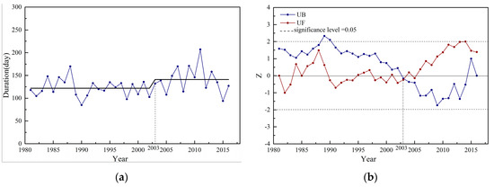 The long-term change of the duration of the dry period. (a) The duration of the dry period from 1981 to 2016; (b) the M-K test of the duration.