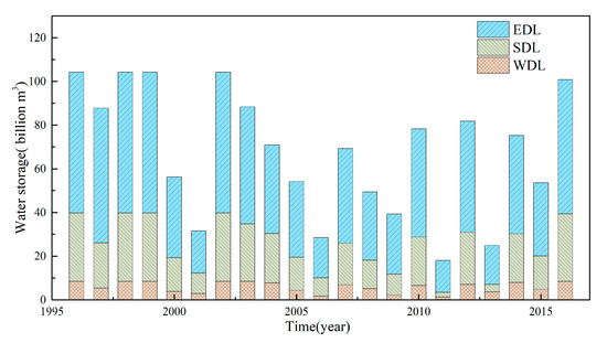 Figure 8 shows the usable water storage of Dongting Lake from 1996 to 2016. According to Equation (5), the usable water storage reaches up to 2.85 billion m3 and 1.81 billion m3 even in the extreme drought year of 2006 and 2011, respectively, while the total water storage content was less than 1 billion m3 during these two extreme drought years in the current condition [30].