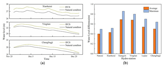 The variation of the water level with IFCS (27 November to 27 December 2016): (a) the fluctuation of the water level at the selected station; (b) the average and maximum water level differences in the Dongting Lake.