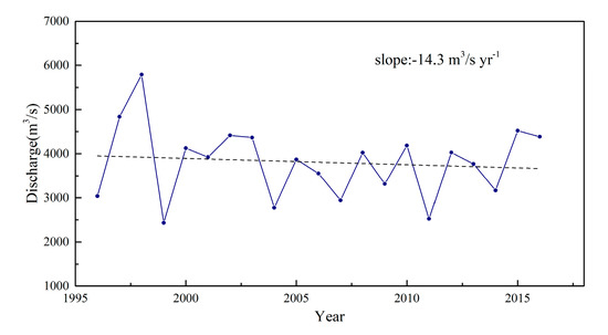 Figure 10 shows the long-term change of the inflow from Yangtze River to Dongting Lake via the “three channels” (see Figure 2). It can be found that the average discharge from the “three channels” decreased from 135 m3/s to 113 m3/s, although the average discharge from the upstream of Yangtze River has increased by 18% (from 5710 m3/s to 6747 m3/s) in the dry season after the operation of TGD. This can be ascribed to the lower water level at the middle reach of Yangtze River, on average about 1.6 m lower in the same dry period after the running of TGD [32]. Now, it is more difficult for the water flowing to the “three channels” from the Yangtze River by gravity. Similarly, the lower bed scoured by clean water from the TGD can increase the outgoing discharge from the lake to the Yangtze River. Consequently, less water can be stored in the lake in dry seasons. On the other hand, several large dams have been built on the “four rivers” during 1995–2016, which leads to the reduction of the inflow from “four rivers” with a decreasing rate of −14.3 m3 s−1/year (see Figure 11). Other reasons like the climate change would also affect the low water level during the dry season as the net rainfall decreased slightly in the post-TGD period [7,8,16] and thereby might intensify the water shortage problem. But other studies show that the effect of future climate on discharge in the Yangtze River Basin is still uncertain [33,34].