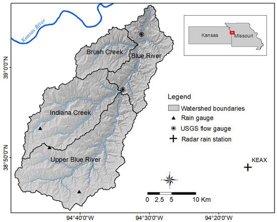 Location of the study area, the Blue River watershed, with major sub-watersheds and the locations of rain gauges, USGS streamflow gauges, and the Kansas City Radar rain station.