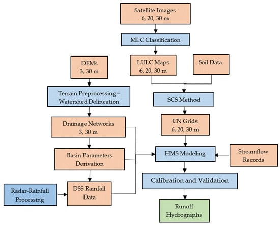 Runoff-rainfall modeling requires a variety of spatial data inputs related to, for example, land use and land cover, terrain, soil, precipitation, and streamflow data records. These datasets are used as inputs for the HEC-HMS model. The method in this study can be described in several major stages (Figure 2). It first derives the LULC maps with 6, 20, and 30 m spatial resolution using the Maximum Likelihood classification (MLC) and performs a change detection analysis, which is followed by delineating the drainage networks with 3 and 30 m spatial resolution DEMs. The process then prepares the soil data in order to derive the Soil Conservation Service (SCS) curve number (CN) values and then prepares NEXRAD rainfall data. The final step includes the model setup and simulation run.