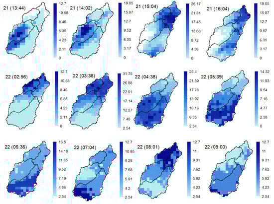 For model calibration, hourly NEXRAD Level III rainfall data, obtained from the National Weather Service (NWS) Weather Surveillance Radar Doppler units (WSR-88D) [], were utilized. The accuracy of NEXRAD precipitation data is based on the Z-R relationship model that is used to estimate rainfall from reflectivity. An automated GIS-based approach was applied to prepare and process the data. A multi-step procedure was implemented utilizing NCEL Radar Software, ArcGIS 10.7, and the standard UNIX Command. The decoding step produced about 2700 radar images for the selected events. Precipitation grids are required to be in the Data Storage System format (HEC-DSS) for use in the HEC-HMS model. HEC-DSS is a dataset system designed to effectively store and retrieve sequential data, such as textual or gridded time-series data []. Figure 3 shows some selected rainfall images for the 2017 flood event of the one-hour NEXRAD precipitation data after processing.