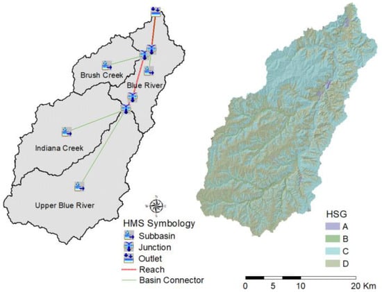 The watershed model prepared by HEC-GeoHMS is shown in Figure 4. The watershed is divided into the four major sub-watersheds to accurately calculate and simulate the runoff. For model calibration and validation, we used three flooding events, which were reported as flash flood events according to NOAA Storm Events Database []. The selected events for model calibration occurred in the periods of 2–6 June 2005 and 21–23 August 2017. The 2008 event was selected for model validation, which occurred from 29 to 31 July 2008 (Table 2). The available hourly and daily gauge data from NOAA/National Climatic Center [] were used to evaluate NEXRAD Level III precipitation. Observed streamflow data from two USGS discharge gauges were available for all events. The study simulated the runoff hydrographs using HEC-HMS. For the accuracy of the runoff simulation, four separate models were used in the simulation to represent each element of the runoff process, including runoff volume, direct runoff, channel flow, and baseflow. The SCS CN loss method was utilized to compute the runoff volume. It estimates precipitation excess according to cumulative precipitation, soil type, land use/cover types, and antecedent moisture []. Soils were classified into A, B, C, and D categories according to their minimum infiltration rates, based on the hydrological soil group (HSG) (more details in National Engineering Handbook and TR-55 report [,]). The Soil Survey Geographic (SSURGO) data, available from the United States Department of Agriculture (USDA) [], were prepared based on both the SSURGO and GeoHMS user’s manual instructions (Figure 4). Using the four SPOT and LANDSAT imagery-generated LULC maps and the soil data, the CN value for each cell in the elevation grid and the average CN value for each sub-watershed were calculated.