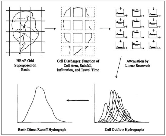 The ModClark model was selected to simulate the direct runoff of the excess precipitation in the watershed to be utilized with NEXRAD precipitation data. The ModClark algorithm is the modified version of the Clark unit hydrograph that is suitable for the use of spatially distributed precipitation data (Figure 5). This distributed parameter model accounts explicitly for variation in runoff travel time and storage. In this method, a grid is overlaid on the watershed, which allows for calculating the distances from all regions of the watershed to the outlet to compute the inflow and outflow. The model then combines them to determine the direct runoff hydrograph [,].
