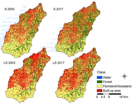 Table 3 and Table 4 summarize the classification accuracy assessment results, including producer’s and user’s accuracies for each image. The overall classification accuracy results with SPOT images increased from 85% (2003) to 92% (2017). The overall accuracy results with LANDSAT images are 87.60% for the 2003 image and 84% for the 2017 image. The calculated classification accuracies show satisfactory results for the purpose of this study, in which LULC maps with different resolutions are produced as inputs for the runoff modeling. SPOT and LANDSAT imagery classification results show an increase in water bodies and forestland and a decrease in farmland/grassland. There is a marginal gain in built-up area (Table 5). As a result, during the study period, farmland and grassland remained the largest land use type, followed by forestland, built-up area, and water bodies.