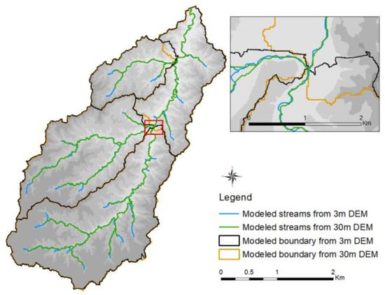 Watershed boundaries and drainage streams extracted from 3 and 30 m DEMs.