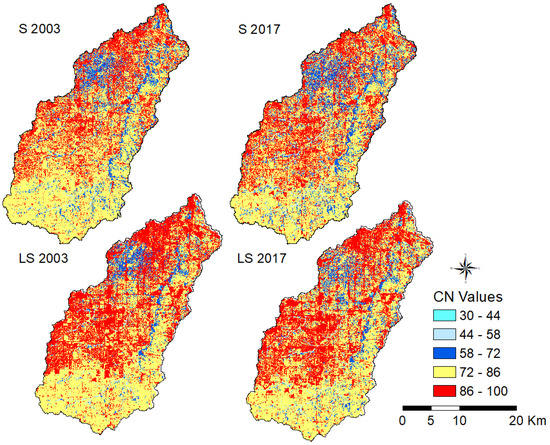CN values estimated from SPOT (S) and LANDSAT (LS) LULC maps.