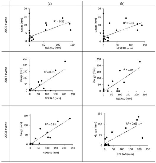 NEXRAD data were validated against gauge rainfall records from three ground-based gauges that were only available for Upper Blue River and Indiana Creek sub-watersheds. Scatter plots in Figure 9 show a significant correlation between NEXRAD and gauge precipitation data for 2008 (R2 = 0.8) and 2017 events (R2 = 0.6), while there is a less significant correlation for the 2005 event (R2 = 0.30). The Upper Blue River sub-watershed data for the 2008 event display the highest correlation, with an R2 value of 0.8. In contrast, for the 2005 event, both Upper Blue River and Indiana Creek sub-watersheds show the lowest correlation (R2 = 0.3). There were some missing data in the gauge records for this event, which affected the correlation results. Validation outcomes of NEXRAD and gauge precipitation usually do not reveal a good relationship because of the possible errors in both of them [,,]. Figure 10 compares the total precipitation of NEXRAD with gauge data. NEXRAD precipitation amounts were overestimated for two flood events compared with gauge rainfall. There is no difference between gauge and NEXRAD rainfall data for 2005 event for both sub-watersheds; however, it is about 0.4 percent for the 2008 event. For the 2017 event, the difference is about 0.2 percent for Indiana Creek and 0.5 percent for Upper Blue River sub-watersheds. The overestimation is probably a result of area (radar grid cell) and point (gauge) errors []. On the other hand, the gauge precipitation might be underestimated due to issues with gauge funnels, which might have been temporarily blocked by grass, bird debris, or other objects, and as a result, the precipitation could be missing or delayed and underestimated [].
