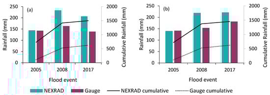 NEXRAD and gauge rainfall data of the flood events for two sub-watersheds (a) Upper Blue River and (b) Indiana Creek.