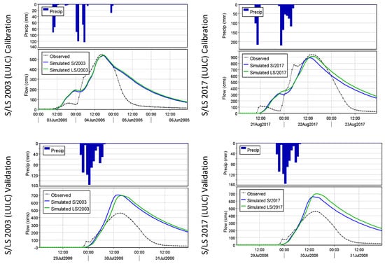 Calibrated and validated hydrographs at the Blue River watershed outlet for SPOT (S) and LANDSAT (LS) LULC conditions.