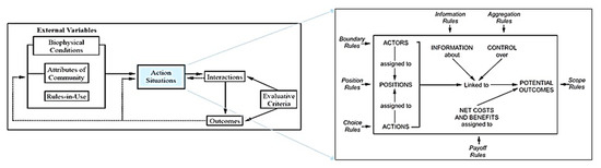 Additionally, as seen in the action situations element of the IAF in Figure 1, in order to specify how the elements of the system are transformed into outcomes we need to identify the characteristics of the actors involved, the positions they hold, and the set of actions that the actors take. Finally, in order to identify the potential outcomes, it is necessary to define the available information and the control over the outcomes of an action as well as the payoff rules that assign costs and benefits to an action’s outcomes [22,24].