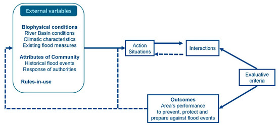 In this research, the institutional analysis framework (IAF) developed by Ostrom [21,22] was used as a roadmap in order to conceptualise the decision-making processes of authorities responsible for flood risk management (see Figure 1). Based on Ostrom’s theory, in order to analyse institutions, we need to identify the external variables that comprise the biophysical conditions, the attributes of the community based on historical data and previously implemented actions and the rules of the system identifying who may implement actions and whom and how these actions affect [23,24].