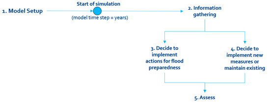 The agents follow specific rules that allow them to get information regarding the available funding and the characteristics of the resilience strategies, interact with the stakeholders to prepare the city for flooding events and implement actions, decide to implement new flood resilience measures, inspect existing flood resilience measures, and maintain them (Figure 3).