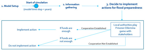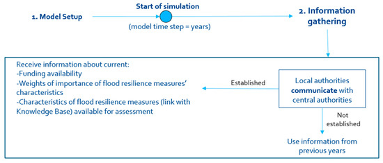 Figure 4. Procedure for information gathering. - Decide to implement actions for flood preparedness: Agents cooperate with the stakeholders to implement several flood preparedness actions. The actions, their priorities, and their positive effects are identified outside the ABM by expert knowledge and may incorporate the findings of LAAs and stakeholder participation processes. The cooperation of the agents is based on a one time prisoner dilemma game that tries to simulate the cooperation procedures of the authorities. The prisoner’s dilemma rules are given in the following table. They were selected so as to depict both incentives of both cooperation or not. If the agents decide to cooperate, then actions are implemented only if available funds exist (Figure 5).