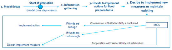 Figure 5. Procedure for implementing actions for flood preparedness. - Decide to implement new measures or maintain existing: Decision making agents cooperate with the Water Utility to implement or maintain flood resilience measures (Figure 6). The list of measures and their specific characteristics like the construction and operation cost, are identified outside the ABM by expert knowledge. The measures are characterized in the PEARL Knowledge Base to which the decision-making agents have access. Local authorities prioritise the implementation or maintenance of measures by performing a multi criteria assessment of all the flood resilience measures under investigation using the following rule:where Sm is the total score of a measure, Wi is the weight of a measure’s characteristics based on the decision making authority’s preferences, and Ci is the measure’s characteristic.