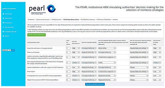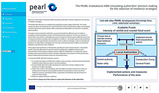 Homepage of the PEARL institutional ABM simulating authorities’ decision making for the selection of resilience strategies.