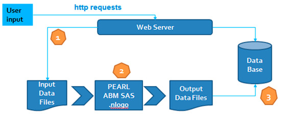 This web-based interface was designed and developed aiming to make the developed tool more user-friendly and available to decision makers for use. The PEARL ABM SAS model was created using NetLogo [36]. The interface is linked to a webserver that operates the NetLogo model and saves the results and presents them to the user, as depicted in Figure 8.