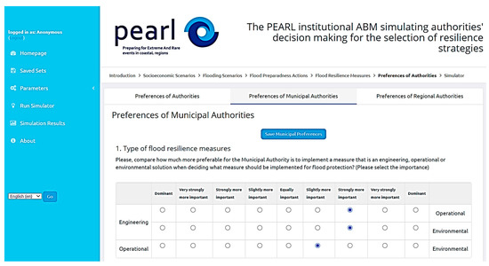 Additionally, the importance of the different characteristics of the flood resilience measures is assessed based on a pairwise comparison that is included in the menu preference of authorities (Figure 10). The interface allows the user to give different preferences for different responsible authorities (municipality and prefecture), thus enabling to model the preferences of different decision making authorities and how these affect their decisions.