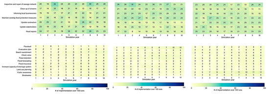 Figure 11 presents the heatmap of the implementation of actions and of measures for three different flood scenarios, a no flood scenario where no floods are recorded in 10 years, an annual medium flood scenario, where floods of low intensity (T < 100 year-flood) are reported every year and an annual high flood scenario, where floods of severe intensity (T > 100 year-flood) are reported every year.