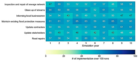 Heatmap of how many times (#) actions have been implemented per simulation year with annual low flood severity (T < 100 year-flood) and just enough funding.