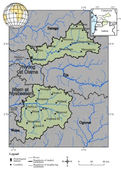 This study focuses on the Nyong (14,438 km2) and Ntem (19,563 km2) watersheds, respectively at Mbalmayo and Ngoazik outlets. These watersheds are located in Central Africa between latitudes 1°15′ N and 4°44′ N and longitudes 11°5′ E and 13°30′ E (Figure 1). The first is entirely included in Cameroonian territory, while the second is located between Cameroon, Gabon and Equatorial Guinea. They belong to the equatorial (Ntem) and sub-equatorial (Nyong) domains, with abundant precipitation. The annual precipitation oscillates around 1600 mm over the Nyong and 1800 mm over the Ntem, distributed over four seasons of unequal importance, including two dry and two rainy seasons (Table 1). The rainy seasons (spring and autumn) are generally very wet with record totals of around 900 mm and marked by numerous thunderstorms, which sometimes cause significant floods. The winter dry season is the only real dry season in the region, with average precipitation fluctuating around 90 mm and 180 mm, respectively, in the Nyong and Ntem watersheds (Table 1). The summer dry season tends to become more humid in the region since the 1980s []. The Nyong and Ntem watersheds are deeply gullied and cut into hills with convex slopes and wide marshy valleys []. On both sides of the main rivers, a topographic landscape in steps is observed, which seems to be the result of brittle tectonics. In the middle part of each watershed, there is a major valley (600 m above sea level on average), which represents the collapse ditch. It is a wide corridor, in the middle of which flows the main river. On the two watersheds, this unit is directly followed on each side of the main river by a large plateau with an average altitude of around 700 m, then large hills (800 m of altitude on average), which are bristling with a few inselbergs located mainly at the limit with neighboring watersheds, and whose altitude can sometimes reach 1200 m []. The geological substratum of these watersheds is made up of a granito-gneissic base on which ferralitic (on the tops and slopes) and hydromorphic (in the shallows) soils develop. The vegetation encountered on these basins is a dense semi-deciduous forest with Sterculiaceae and Ulmaceae strongly subjected to anthropic actions [].