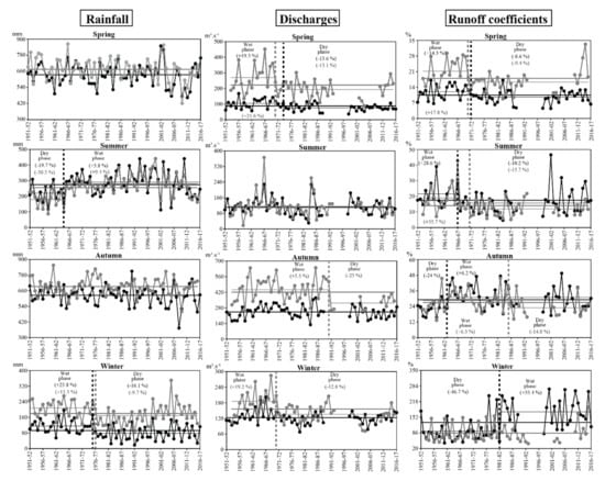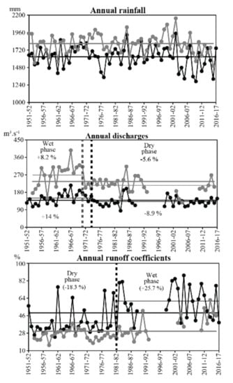 During the rainy seasons, primarily in the spring, precipitation has changed moderately, so that no sudden mean inflexion point has been detected in their series. In return, the discharges and the runoff coefficients for this season have decreased significantly since the 1970s. Similarly, the examination of the deviations from the mean of these variables generally shows significant decreases for the discharges and the runoff coefficients, while the rainfall does not decrease or decreases very slightly (Table 3). The decline in winter rainfall since the 1970s appears to be closely related in amplitude to that of spring flows. Although the correlations between them are not significant (r < 0.32 on both catchments), the rhythm of evolution of these two variables over the decades is fairly constant. This is observed during the 2010s, for which a small drop in winter rainfall led to a similar evolution in spring runoff coefficients and discharges (Table 3). This influence of winter precipitation has already been suggested by Liénou et al. []. These authors wrote that from the 1970s, the decrease in winter rainfall created a greater water deficit (evaporation and soil water reserve) in the watershed area at the start of the first rainy season in spring. This aridification of winter means that a greater part of the precipitation received during the spring first contributes to filling this water deficit, and therefore, the fraction that generates runoff is reduced. This then translates into lower runoff volumes for the same average depths of precipitation during spring, which explains the drop in the runoff coefficient (Figure 4).
