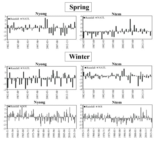 The NATL indices, on the other hand, are positively correlated with winter rainfall (Table 5). An increase in the temperature of the Tropical North Atlantic would be concomitant with abundant rainfall in the watersheds studied during this season and conversely (Figure 5). A different situation was nevertheless observed in these watersheds in 1990–91, 1996–97, 1997–98, 2004–05, 2015–16, etc. The proportion of years for which the same sign of anomalies was observed between these two variables during winter is 62% in the Nyong basin and 61% in that of Ntem (Table 6).