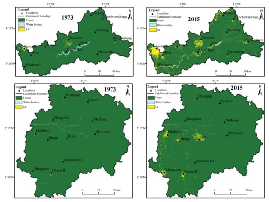 A diachronic analysis of the classifications carried out on two dates (1973 and 2015) shows for both watersheds changes in land use marked not only by an increase in IA but also by a decrease in forests and water bodies (Figure 6). Between 1973 and 2015, forests and water bodies decreased by 6% and 42%, respectively, in the Nyong watershed. Their decreases on the Ntem between 1973 and 2015 are 1% and 32%. Between these same years, the increase in IA reached 771% in the Nyong watershed and 451% in the Ntem watershed (Table 7). Figure 6 also shows that the disappearance of the forest cover is localized around urban centers, mainly located in the west, near Ngoazik in the case of Ntem. For the Nyong, deforestation is certainly continuous throughout the watershed, but the change is more significant in the west, with the important boom in the city of Yaoundé, not far from Mbalmayo.