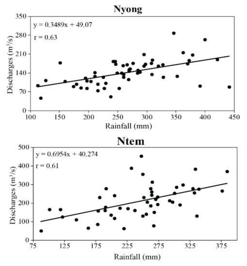 The impact of the increase in the IA on runoff has already been demonstrated in other forest environments (South America), particularly in the cases of certain watercourses such as the Amazon [], Upper Xingu [] and Parana []. The discharges of these watercourses have indeed increased, following a reduction in the forest area of their watersheds, which seem relatively greater than that observed in the Nyong and Ntem watersheds. The rate of deforestation in the entire Amazon basin, for example, reaches 30% [].